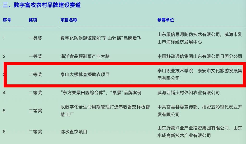 近日,第三届山东省数字乡村发展创新大赛圆满落幕,我校财经系报送的《泰山大樱桃直播助农项目》获数字富农农村品牌建设赛道二等奖。
