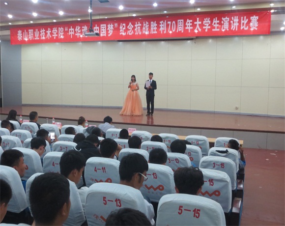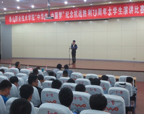 为纪念抗日战争胜利暨世界反法西斯战争胜利70周年,面向学生开展以爱国主义为核心的民族精神教育。9月15日,学院在图书馆报告厅举办了“中国梦中华魂”主题演讲比赛。比赛邀请学工处副处长钱长松,国家级普通话评测员董丽、孙秀平、李玉国担任评委。