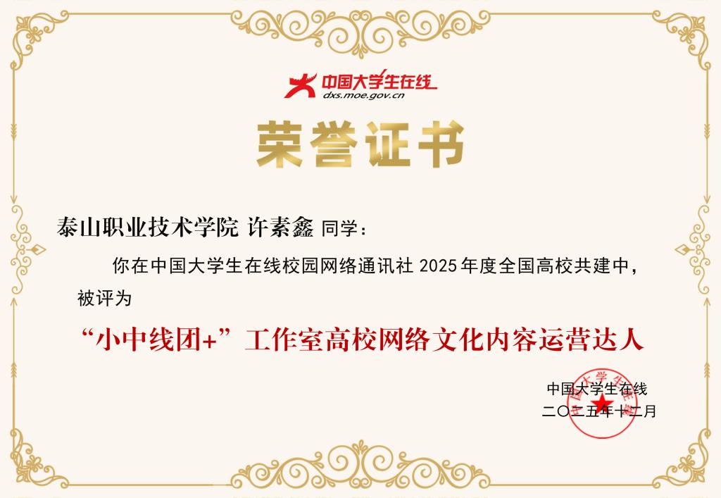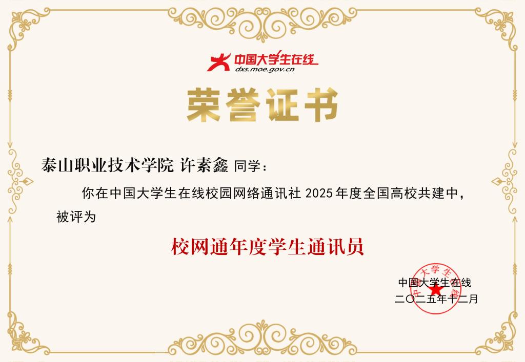 2025年,校网通站紧跟中国大学生在线步伐,以笔为媒、以网为桥,通过原创图文、视频等形式讲好校园故事,传播青春正能量。校学生会成员、思政部许素鑫同学被评为“‘小中线团+’工作室高校网络文化内容运营达人”和“校网通年度学生通讯员”;校学生会成员、旅游系董欣冉同学被评为“校网通年度学生通讯员”。