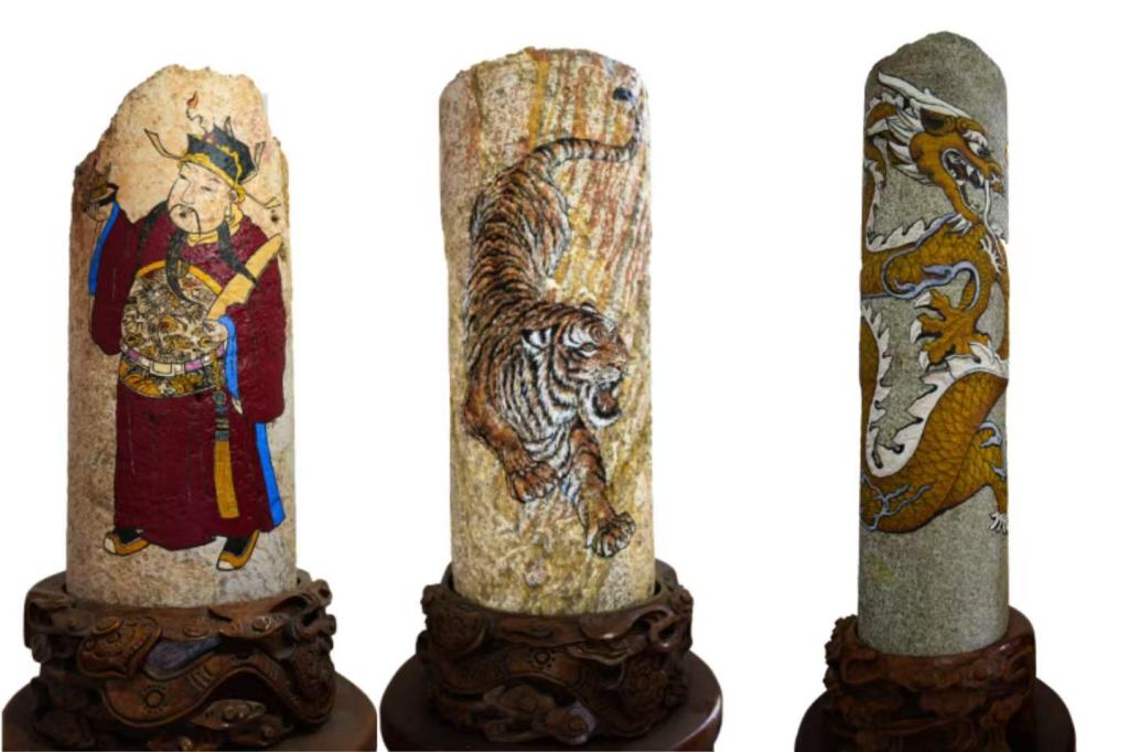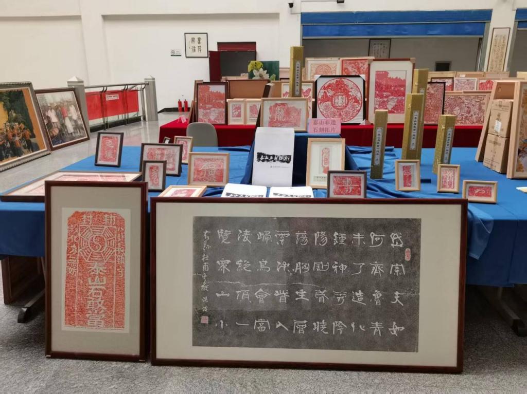 色彩明丽的泰山风物油画系列作品定格泰山雄奇风光,传递对家乡山水的深情礼赞;掐丝填彩作品以金丝为骨、釉料为魂,勾勒流光溢彩的传统纹样;剪纸作品以薄纸为媒,用精巧剪刻讲述民俗故事;泰山石刻拓片,与《泰山文化艺术研究》专著相映成趣,帮助师生触摸历史脉络、品读文化底蕴。