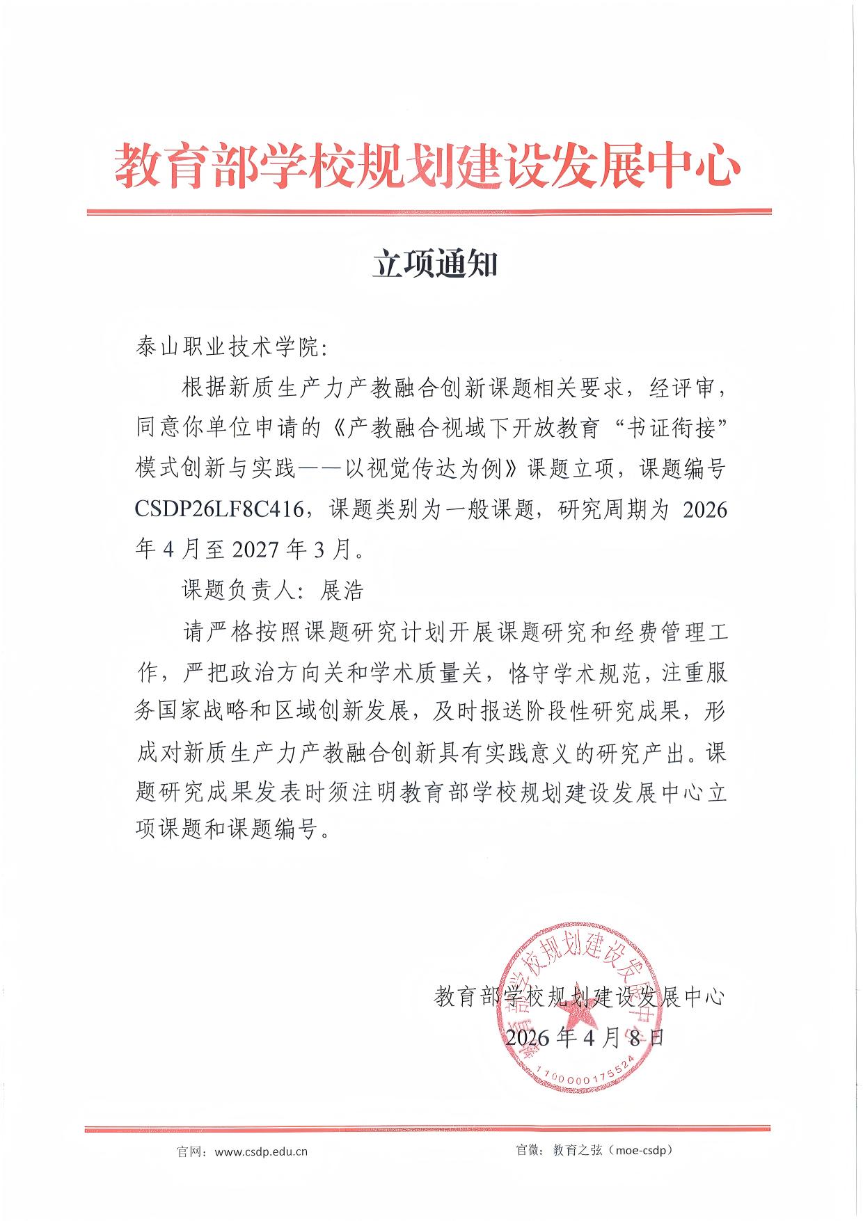近日,教育部学校规划建设发展中心公示了第三批“新质生产力产教融合创新课题”立项名单,我校展浩老师主持的《产教融合视域下开放教育“书证衔接”模式创新与实践——以视觉传达为例》课题获批立项。