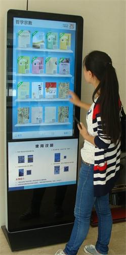 电子书借阅机安装在图书馆一楼大厅北侧,预装了3000种独家授权的正版热门图书,内容涵盖精品推荐、经典名著、生活保健、经管理财、成功励志、小说传记、政史军事、文学艺术、科学技术、社会法律、哲学宗教、亲子育儿等,图书与出版社纸书同步发行,每月更新150本电子图书。电子书借阅机通过多点触控进行操作,支持滑动、拖动等手势。读者只要用手指轻轻地触碰显示屏上的图片就能实现对主机的操作,读者扫描二维码下载并安装超星移动图书馆客户端后,只需在电子书借阅机屏幕上选择心仪图书,扫描图书封面二维码,便可将该书下载至手机,免费体验高清电子阅读。