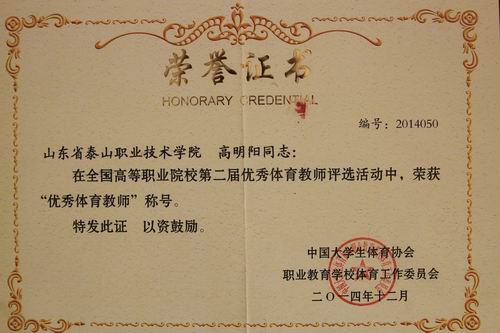 12月18至21日,全国高职高专体育工作研讨会暨大体协职教分会与体育教学联席会2014年年会在广西南宁举行,我院教师高明阳获全国“优秀体育教师”称号。