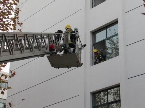 3:40分,演练开始。同学们用毛巾捂住口鼻向宿舍楼外奔跑,宿舍管理员迅速通过各种方式向保卫处报告情况,并拔打“119”火警电话向消防部门求救。疏散组根据预案组织营救,让学生从消防安全通道撤离火灾现场。看到几名学生困在宿舍挥动衣物大喊“救命”,消防员立刻升起消防云梯,迅速将被困学生救下,对受灾地喷水灭火。疏散人员到达应急疏散场所后,市消防支队四中队消防员为同学们详细讲解了灭火器的操作要领和使用方法,并组织在场学生进行灭火器现场操作演习。