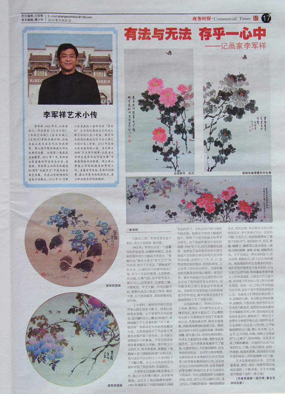 我院教师李军祥的国画艺术在2014年9月20日的《商务时报》第17版做了整版介绍,主要刊登了李军祥老师近期创作的国画作品五幅、个人肖像、艺术简介以及国家一级作家崔西明先生为李军祥写的艺术评论文章。