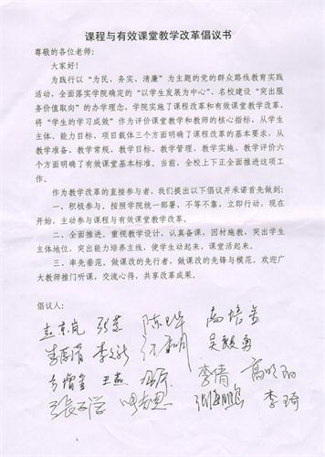 为深化整体教改和有效课堂教学改革,加快名校建设的步伐,近日,9个教学系部的教学主任和教学科长积极倡议,联名签署了“课程与有效课堂教学改革倡议书”,倡议并承诺:(一)积极参与。按照学院统一部署,不等不靠,立即行动,现在开始,主动参与课程与有效课堂教学改革。(二)全面推进。重视教学设计,认真备课,因材施教,突出学生主体地位,突出能力培养主线,使学生动起来、课堂活起来。(三)率先垂范。做课改的先行者,做课改的先锋与模范。