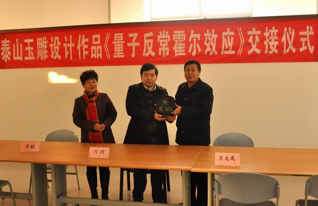 “量子反常霍尔效应”是由中国科学院物理研究所和清华大学物理系科研人员联合研究的国际大型科研项目,杨振宁(诺贝尔物理学奖获得者)称此项成果为“诺贝尔奖级科研成果”。为纪念“量子反常霍尔效应”的成功发现,受科研团队成员何珂博士委托,我院玉雕设计专业教师李利鲁、申传禄设计制作了泰山玉雕“量子反常霍尔效应”纪念品。