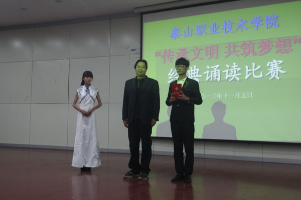 为深入贯彻落实党的十八大提出的“建设优秀传统文化传承体系,弘扬中华优秀传统文化”重大战略任务,积极推进学习型社会建设和全民读书活动,按照中共山东省委宣传部、山东省文明办、山东省语委、山东省教育厅和山东广播电台《鲁文明办【2013】20号文件》精神,11月5日,我院在图书馆报告厅隆重举办了“传承文明,共筑梦想”经典诵读比赛决赛,学院党委副书记张清民出席并为获奖选手颁奖。