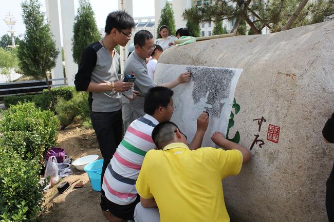 5月15日下午,应学院邀请,中国文物学会文物修复专家、中国美术家协会、九三学社社员、画家张亚明先生来我院为“泰山书院”碑刻做拓片,党委委员、纪委书记宋元明全程陪同,工艺美术系相关师生和社团参与了活动。