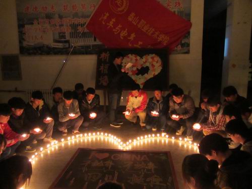 活动中,全系教室8:02熄灯默哀一分钟,随后同学们点亮了420支蜡烛,为雅安人民送上祝福,并制作了祈福墙。