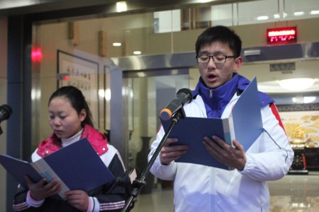 学院国旗护卫队的同学严肃庄严地将五星红旗护送到升旗台上,伴随着国歌的奏响,五星红旗冉冉升起。升旗后财经系学生朗诵了《放歌十八大》,慷慨激昂地表达了当代大学生为祖国发展而努力的决心以及对祖国未来更加繁荣昌盛的信心。学院新疆班学员以《如何做合格大学生》为题,提出要守纪律、懂礼仪、认真读书、报效祖国。