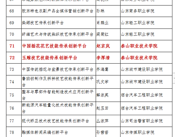为贯彻落实《教育部财政部关于实施职业院校教师素质提高计划(2017-2020年)的意见》(教师〔2016〕10号)等文件精神,根据《山东省教育厅关于实施职业教育技艺技能传承创新平台建设计划的通知》(鲁教师函〔2017〕29号),山东省教育厅组织开展了第三批山东省职业教育技艺技能传承创新平台(以下简称创新平台)立项评审工作,我院生物系赵京岚老师主持的“中国插花花艺技能传承创新平台”和教育与艺术系李厚清老师主持的“玉雕技艺技能传承创新平台”成功入选为山东省第三批职业教育技艺技能传承创新平台。