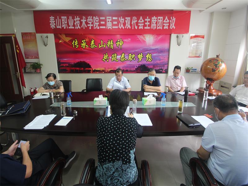 8月27日上午,在致远楼二楼会议室召开大会主席团会议,张勇华主持会议,主席团全体成员参加会议。会议表决通过了《院长工作报告》、《财务工作报告》、《工会工作报告》、《工会经费审查情况报告》、《泰山职业技术学院院绩效分配办法(修订稿)》、《泰山职业技术学院“十四五”发展规划》六项讨论议案。大会完成全部议程,胜利闭幕。