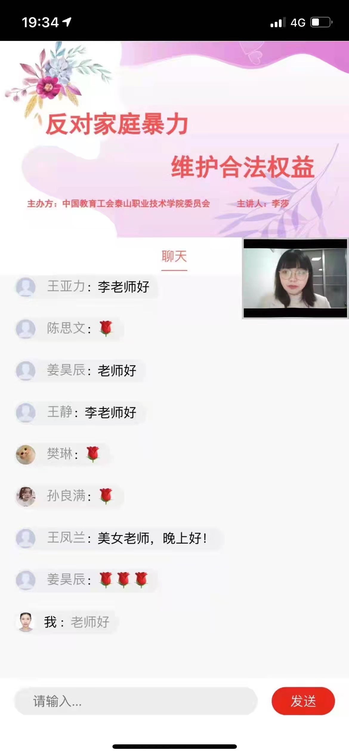 3月18日晚上,学院法治办李莎老师通过线上直播的形式,为学院女职工解读《反家庭暴力法》有关内容,我院女职工200余人在线观看,李莎老师以《反对家庭暴力 维护合法权益》为主题,通过以案释法,围绕家庭暴力类型、人身安全保护以及家庭暴力是否构成刑事犯罪等内容进行了分享,本次线上讲座反应良好,互动频频,广大女职工增强了依法维权意识,掌握了依法维权的途径和方法,得到了广大女职工的高度赞扬。【供稿:工会 图/文/王桂珍】