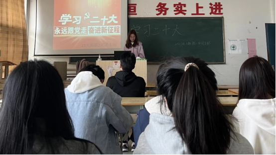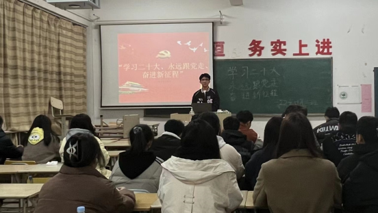 各班团支书通过多媒体展示讲解、互动讨论等形式,带领同学们回顾党的二十大报告原文、新时代十年来党和国家事业取得的历史性成就,同学们纷纷表示要坚定政治信仰,锤炼优秀品格,踏实学习,勤奋进取,为中华民族伟大复兴的中国梦贡献青春力量!