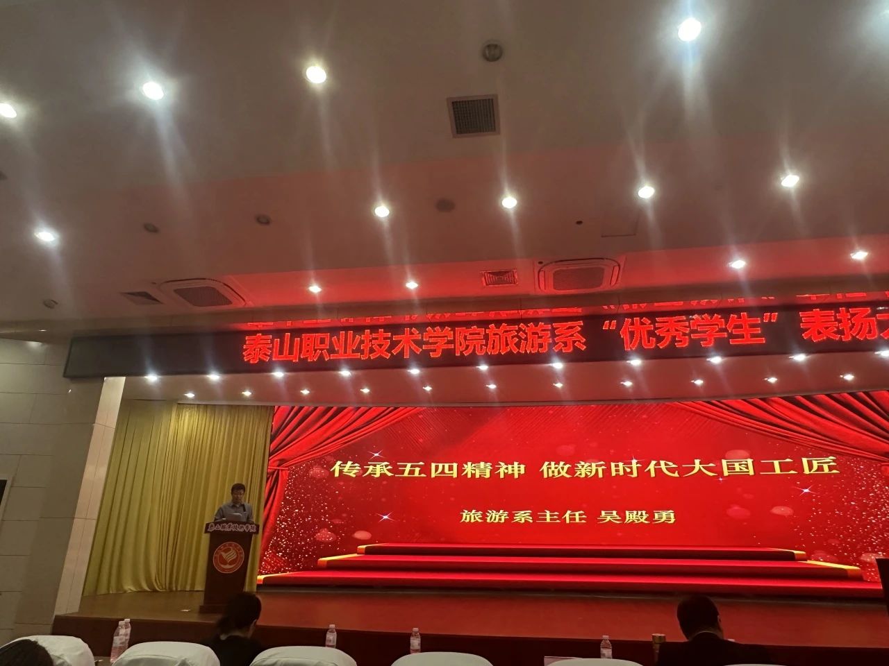 旅游系主任吴殿勇以“传承五四精神 做新时代大国工匠”主题演讲,吴主任强调,作为旅游系学子应积极参加系部活动,努力提高自己的能力和素养,更好的传承五四精神,弘扬中华传统文化。