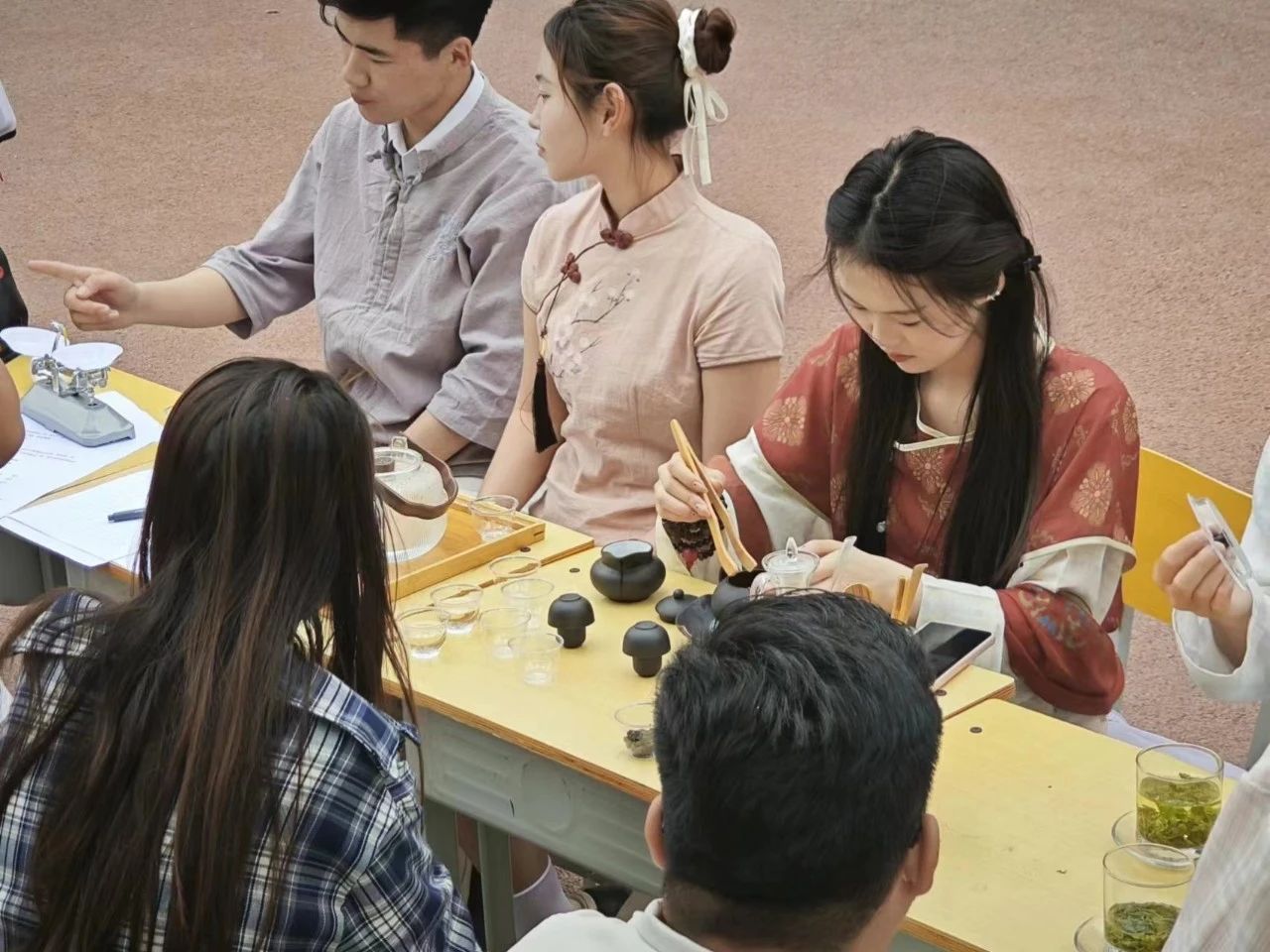 端茶礼仪作为茶文化的重要组成部分,也在活动中得到了充分的展示。学长学姐们耐心讲解,同学们认真学习,每一个动作都显得那么庄重而优雅。在茶香萦绕中,同学们不仅学会了如何品茶,更学会了如何待人接物,如何在日常生活中践行茶道精神。