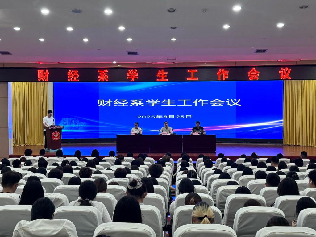 8 月 25 日,财经系在图书馆报告厅召开学生工作会议。财经系党总支书记张建明、财经系新媒体团队负责人高倩倩、财经系学生科副科长安然及财经系 2024 级全体学生参加会议。
