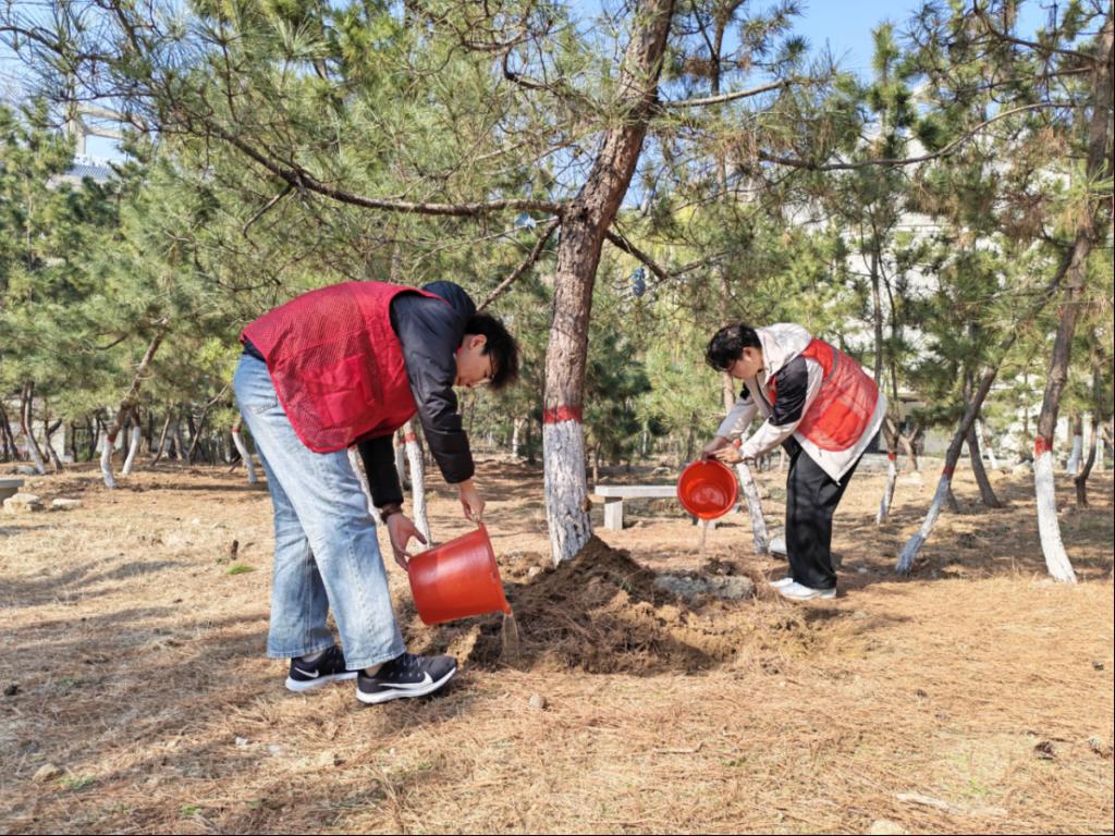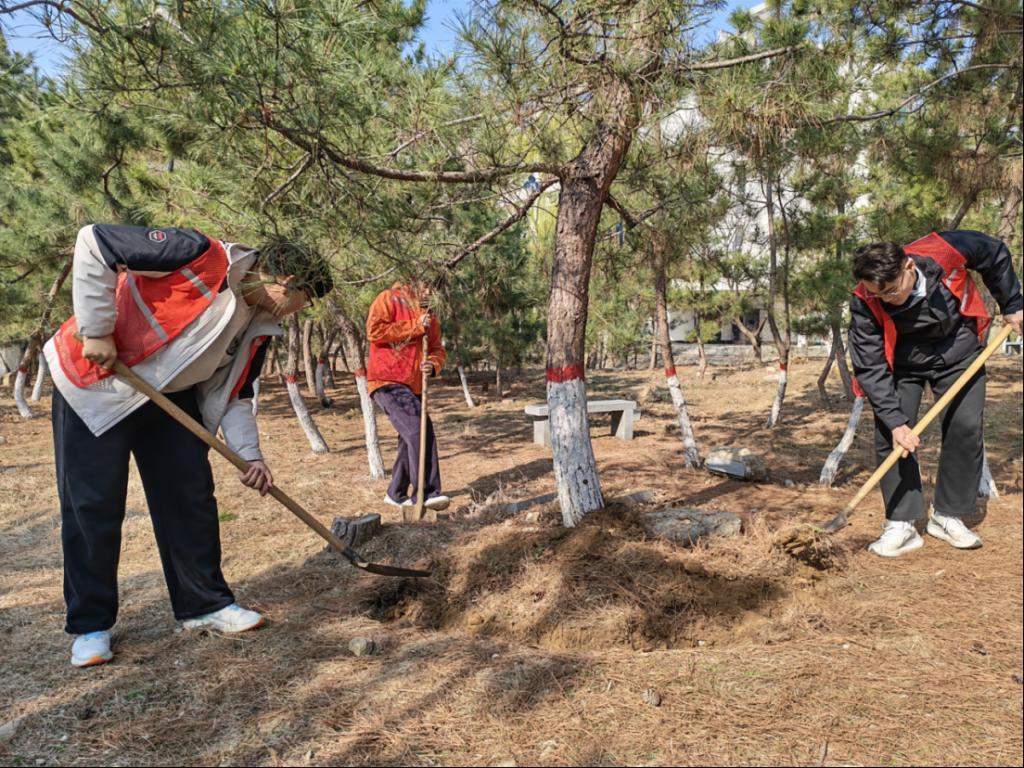 学生科科长王亚楠,教师张茹、张姝、王晶与同学们共同参与。大家分工协作、默契配合,认真完成翻土、浇灌等工作,悉心呵护每一株绿植,在劳动中感受自然之美、践行环保理念。