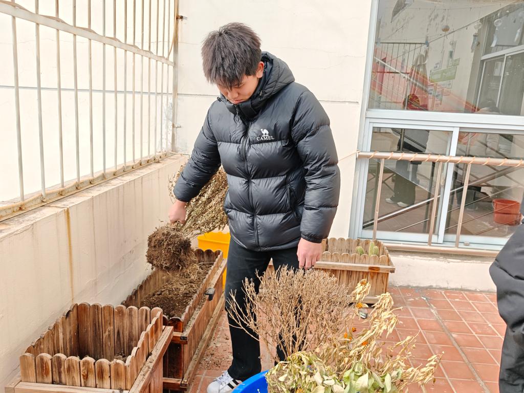 同学们分工明确,认真拔除杂草、清理落叶、挥锹松土、提水浇灌,各个环节有条不紊。露台环境焕然一新,为春日的校园增添了一抹亮色。