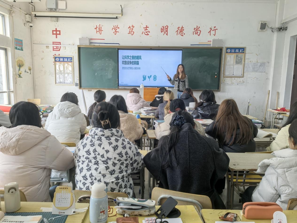 主讲教师发出“和平科普”倡议,呼吁同学们从辨别谣言、关注全球议题、尊重文化多样性做起,将科学素养转化为维护和平的实际行动,以理性之光、青春之力践行人类命运共同体理念。