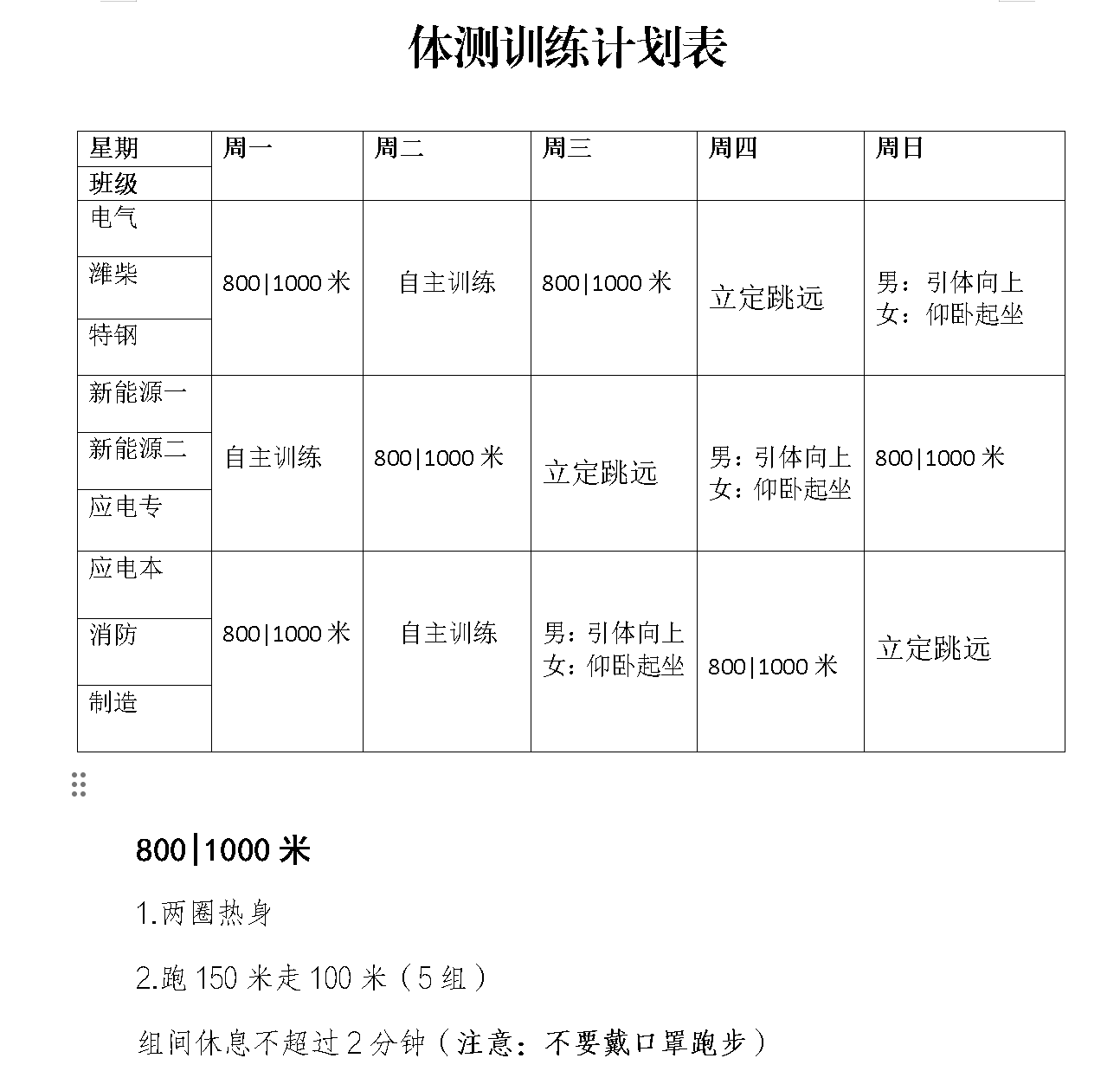 训练期间,每晚通过“今日校园”进行签到,保障各班有序集合。夜间训练围绕体测核心项目制定计划,涵盖长跑(提升耐力)、立定跳远(打磨爆发力)、坐位体前屈(拉伸柔韧性)等项目,训练节奏循序渐进,助力学生逐步补齐短板、适应体测节奏。
