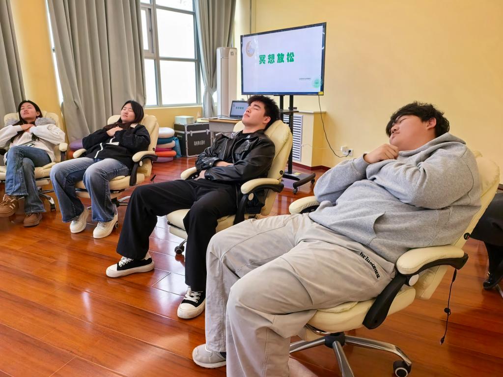 王静带领同学们进行正念冥想体验。在舒缓的音乐与正念引导语中,搭配精油芳疗,同学们深度放松身心,部分同学进入睡眠状态。