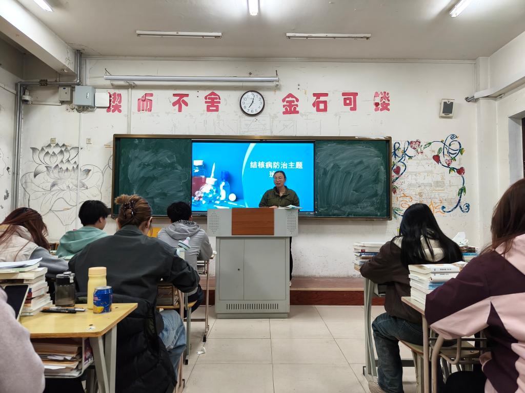 班主任从“认识结核病”入手,介绍了结核病的传播途径及常见症状,强调咳嗽、咳痰持续两周以上或伴有低烧、盗汗等情况,应高度怀疑并及时就医。讲解了症状筛查、医学影像检查及实验室检查等诊断手段,并从控制传染源、切断传播途径两个层面阐述了日常防护要点,提醒学生保持室内通风、加强体育锻炼,增强自身免疫力。