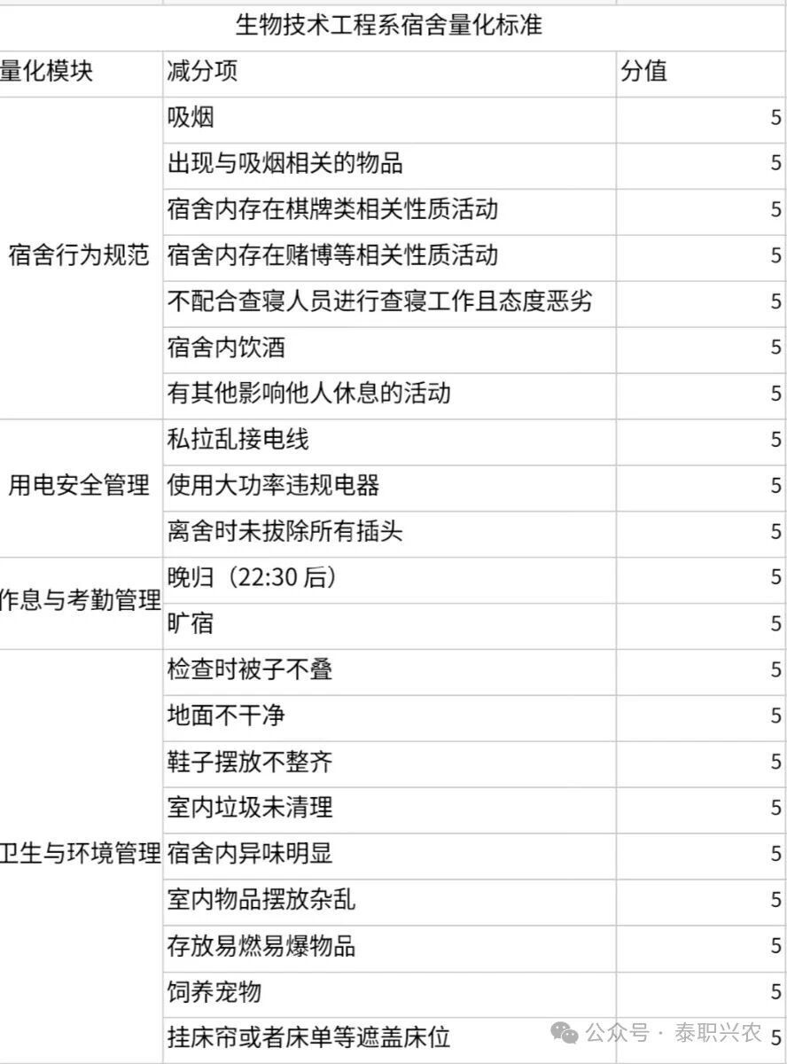 宿舍量化扣分标准: