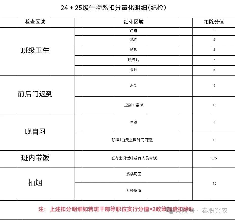 为规范学生日常行为,强化班级与个人纪律管理,现将生物系早操、纪检、宿舍量化扣分标准汇总如下,所有标准严格执行。