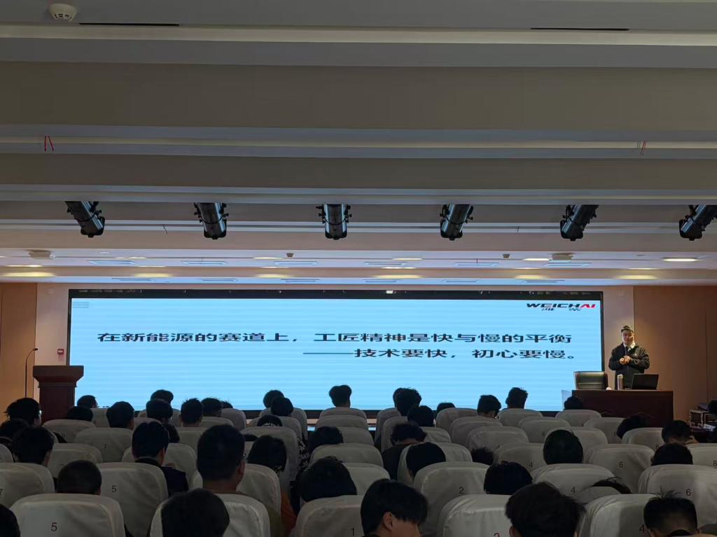 潍柴控股集团有限公司高级工程师、山东省技术能手、潍坊首席技师范明德担任主讲。他以《工匠精神与新能源未来——从技术深耕到职业成长》为题,结合自身多年技术攻关与成长经历,阐释了工匠精神的深刻内涵与时代价值。他从新能源产业发展趋势出发,勉励同学们扎根专业、精益求精,在技术深耕中实现职业理想。讲座现场气氛热烈,同学们认真聆听并积极互动。
