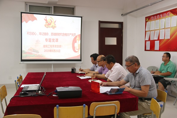 为庆祝建党98周年,认真学习贯彻习近平总书记重要指示精神,6月25日,建筑工程系党支部副书记潘平在行知楼A608会议室为支部党员上党课。