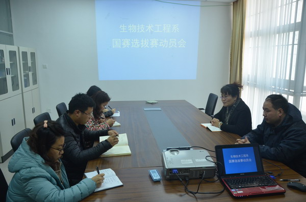 动员会上,系分管教学副主任赵京岚介绍了近三年生物系技能大赛整体水平,分析了参与大赛对于我系及师生的意义,要求参赛师生做好赛项各项系统工作,包括赛项方案的解读、各个赛项的注意事项、学生参赛心理压力疏导、防止赛项意外发生等。之后,各赛项指导老师汇报了备赛进展情况,并针对系内制定的大赛目标作了表态。