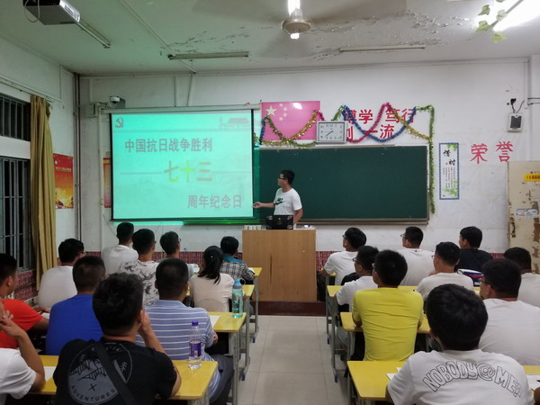 9月3日是中国人民抗日战争胜利纪念日,为了纪念中华民族捍卫国家独立和民族尊严的伟大胜利,铭记历史,不忘国耻,增强大学生们的忧患意识和时代使命感,9月3日,机电系开展了“纪念中国抗日战争胜利73周年”系列活动,包括升旗仪式、集体宣誓、观看优秀抗日题材电影、纪念抗日战争胜利专题知识分享会等。