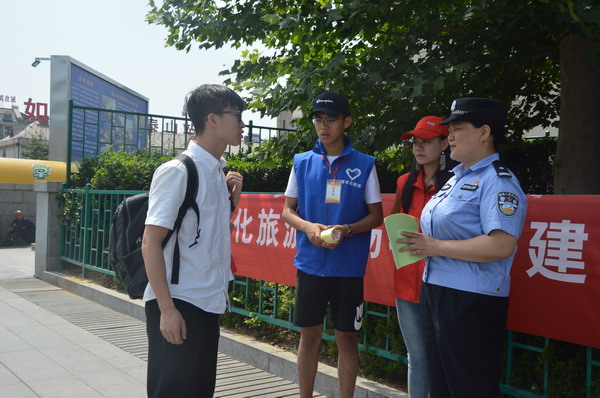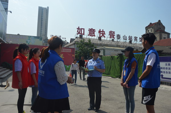 泰山站站长强调了活动注意事项,对志愿者进行了工作安排。志愿者在车站统一安排下,重点开展了创建文明城市宣传、制止不文明现象、对火车站乱停放车辆进行整理。他们将乱摆乱放的车辆按照顺序停放好,对过往旅客进行文明宣传,号召大家自觉遵守市民道德规范和行为守则,出行时自觉维护公共秩序,不闯红灯,不跨护栏,不违章停车,遵守交通秩序,禁止出现不文明行为。