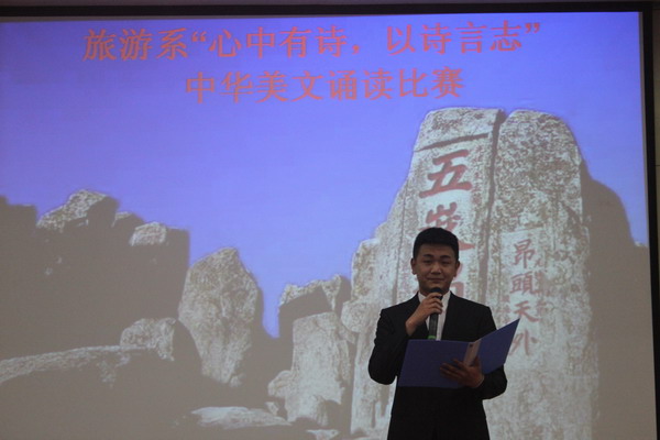 通过开展诵读活动,倡导阅读经典,与高尚对话,与智慧碰撞,在诵读中继承弘扬优秀文化遗产,践行社会主义核心价值观。【供稿:旅游系 文:吴殿勇 图:杜鑫 编辑:李伟】