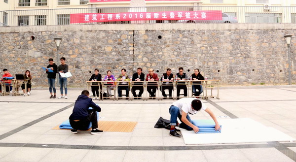 为加强宿舍文明建设,有效督促、激励同学们养成良好的生活习惯, 10月13日下午,建筑工程系在行知楼下U型广场举办了“2016届叠被子”大赛。