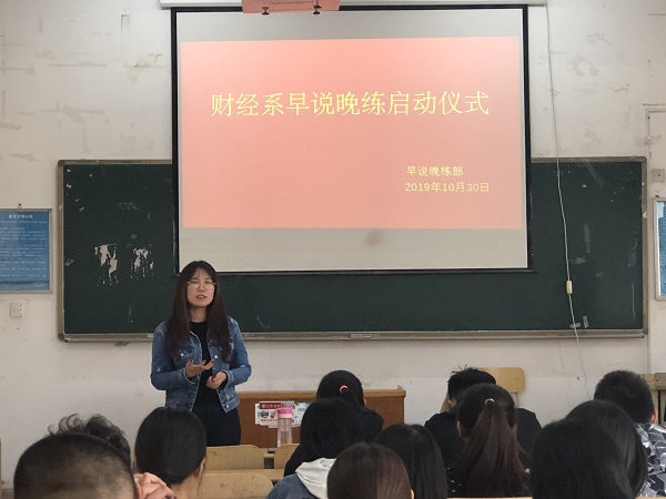 为进一步培育和弘扬社会主义核心价值观,营造积极向上的校园文化氛围,10月30日,财经系在明德楼504教室举行“早说晚练”活动启动仪式,19级各班班长、团支书参加活动。