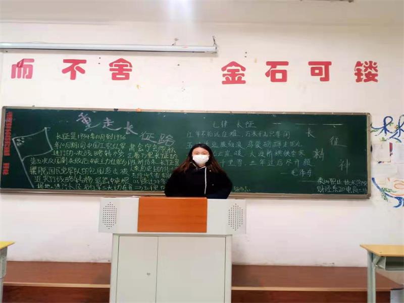 3月1日,财经系各班在晚自习开展“重走长征路”主题班会活动。班会主要围绕长征精神的来历背景,通过负责人演讲相关内容,学习“中国大学生在线”公众号内容,使同学们更深入了解长征精神的意义和来历,使长征精神传递下去。