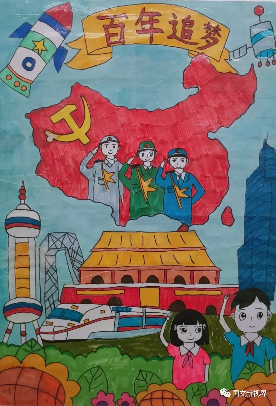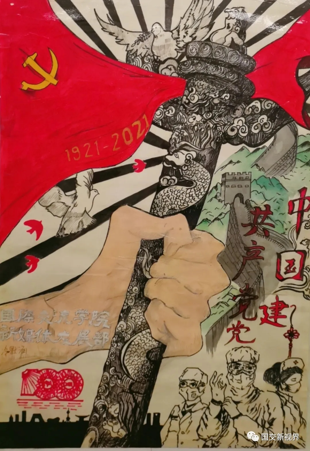 百年风雨兼程,世纪沧桑巨变。为庆祝中国共产党成立100周年,向党的百年华诞献礼,2021年5月中旬,国际交流学院开展了以 “ 献礼建党百年,绘画红色经典”为主题的海报展览。本次庆祝“建党百年”手绘海报设计大赛面向全系进行收集,经班级层层筛选,展出优秀作品共7张,于国际交流学院走廊进行张贴展示。