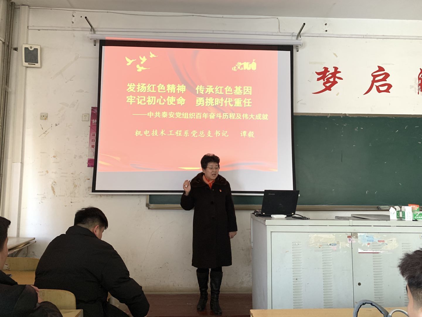 本次讲课由谭毅书记主持,她指出:自中国共产党成立以来,无数革命先烈为了党和人民的事业抛头颅、洒热血,奉献了自己的一切。他们的革命意志和奉献精神值得所有当代青年学子学习 并讲解泰安红色文化,红色基因作为先进思想文化因子的高度凝练和升华,已然深深地融入中华民族的灵魂血脉之中。传承好红色基因,才能筑牢中华民族伟大复兴之魂,凝聚起同心共筑中国梦的磅礴力量。