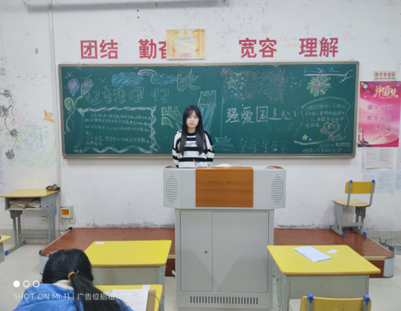 以史为镜,可以知兴亡。在这具有伟大意义的纪念活动中,我们心情激动,感慨万分,负责人以观看视频的形式让同学们大致了解香港回归这一特定的历史事件。随后,同学们开始轮流发表自己的见解,从中华民族一段段被侵略被压迫的屈辱历史中,想象旧中国的积贫积弱,从今天的幸福生活中感受祖国的发展,深刻领会到祖国统一的来之不易。