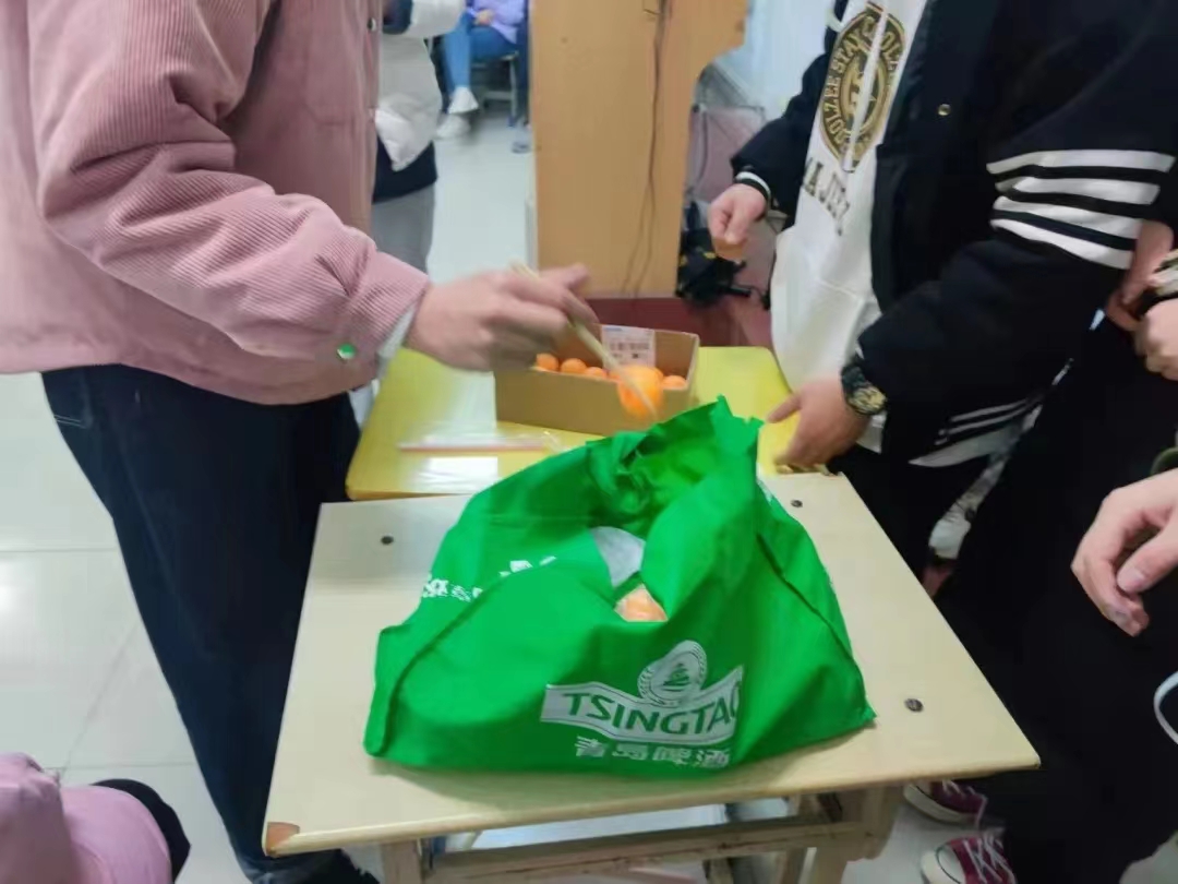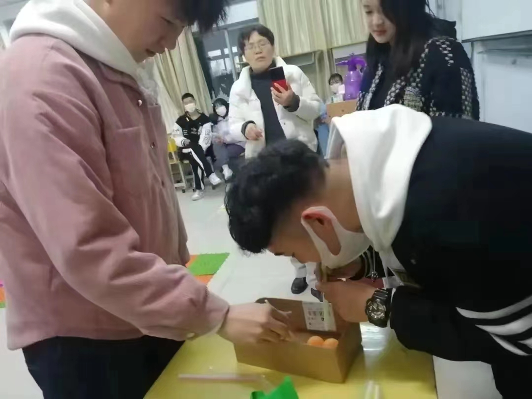 一人用筷子夹乒乓球,另一人拿吸管用嘴吸,使乒乓球全部移出盒子。这个小游戏考验了同学们的灵敏度,增强了游戏的趣味性。