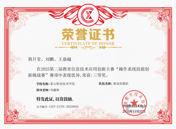 近日,2025第二届全国教育信息技术应用创新大赛“操作系统技能创新挑战赛”圆满落幕,我校军民融合教育系获三等奖2项。