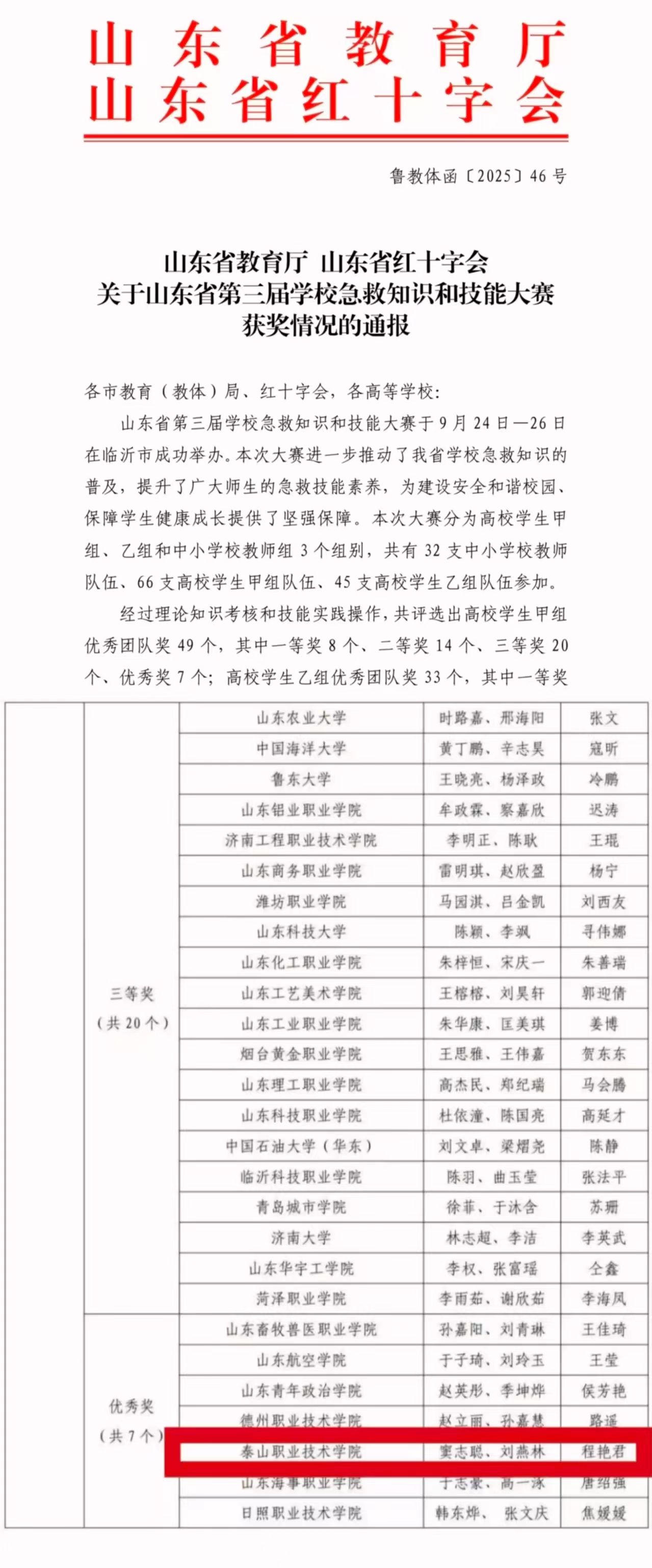 近日,第三届山东省学校急救知识和技能大赛在临沂举办,我校教育与艺术系窦志聪、刘燕林同学获得优秀奖,指导教师程艳君。