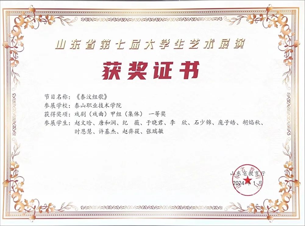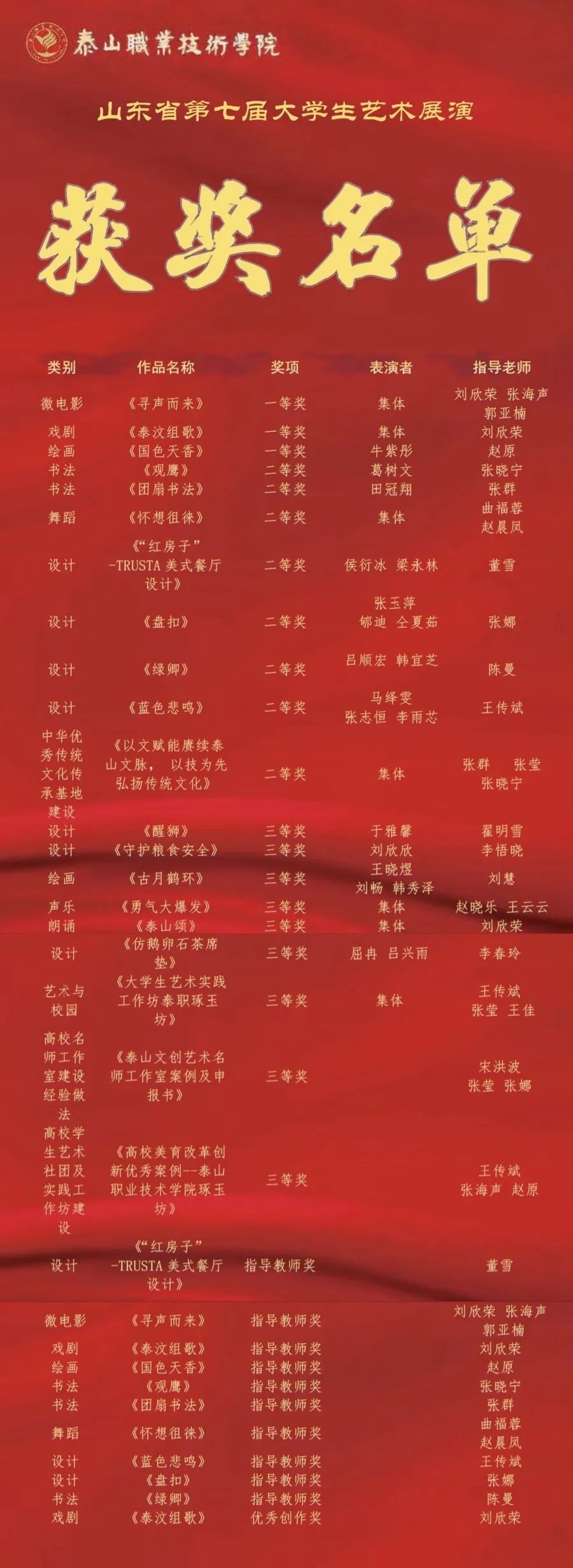 近日,山东省教育厅对山东省第七届大学生艺术展演获奖名单予以公示,在全部十二项赛事中,泰山职业技术学院团委选送作品共斩获31个奖项,取得一等奖3项、二等奖8项、三等奖9项、指导教师奖10项、优秀创作奖1项,实现了省级大学生艺术节一等奖的零突破,彰显了泰山职业技术学院在艺术教育和创作方面的优秀成果。