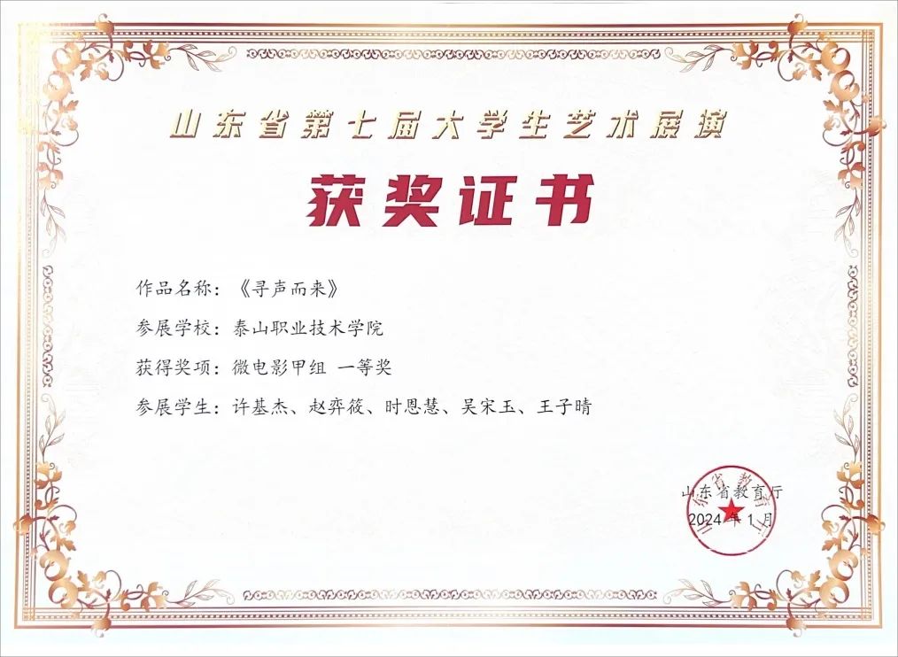 此次获奖不仅是对我院美育实践建设成果的肯定,更进一步激发了青年学子的创新创作活力。一直以来,泰山职业技术学院始终践行“以美育人、培根铸魂、立德树人”美育育人理念,将培育和践行社会主义核心价值观融入美育全过程。接下来,学院将以此次比赛为契机,加强和推进高水平大学生艺术教育建设,大力弘扬传承优秀传统文化和中华美育精神,深化美育教育综合改革发展,积极打造展示风采、锻炼自我、提升素养的美育实践平台,全面提升学生感受美、表现美、鉴赏美、创造美的能力,积极构建新时代高校美育育人新格局。