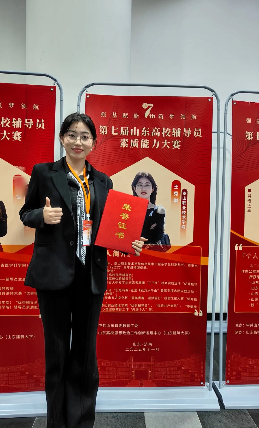 11月1日,第七届山东高校辅导员素质能力大赛在山东建筑大学成功举行。我校信息技术工程系辅导员王秀琳作为驻泰高校唯一闯入决赛的选手,凭借扎实的专业素养和出色的现场发挥从179名参赛选手中脱颖而出,荣获三等奖,取得了我校在近三届比赛以来最好成绩。