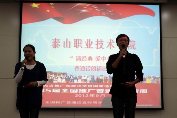 为传承和发扬中华民族优秀传统文化,倡导社会主义核心价值观与现代文明,值全国第15届普通话推广宣传周之际,于9月12日在图书馆一楼报告厅举办了“爱中华۰诵经典”普通话朗诵比赛活动。参赛选手们激情澎湃的朗诵博得观众阵阵掌声。学院副院长马培安亲临现场指导,并作重要发言。本次活动由学工处、教务处联合举办。