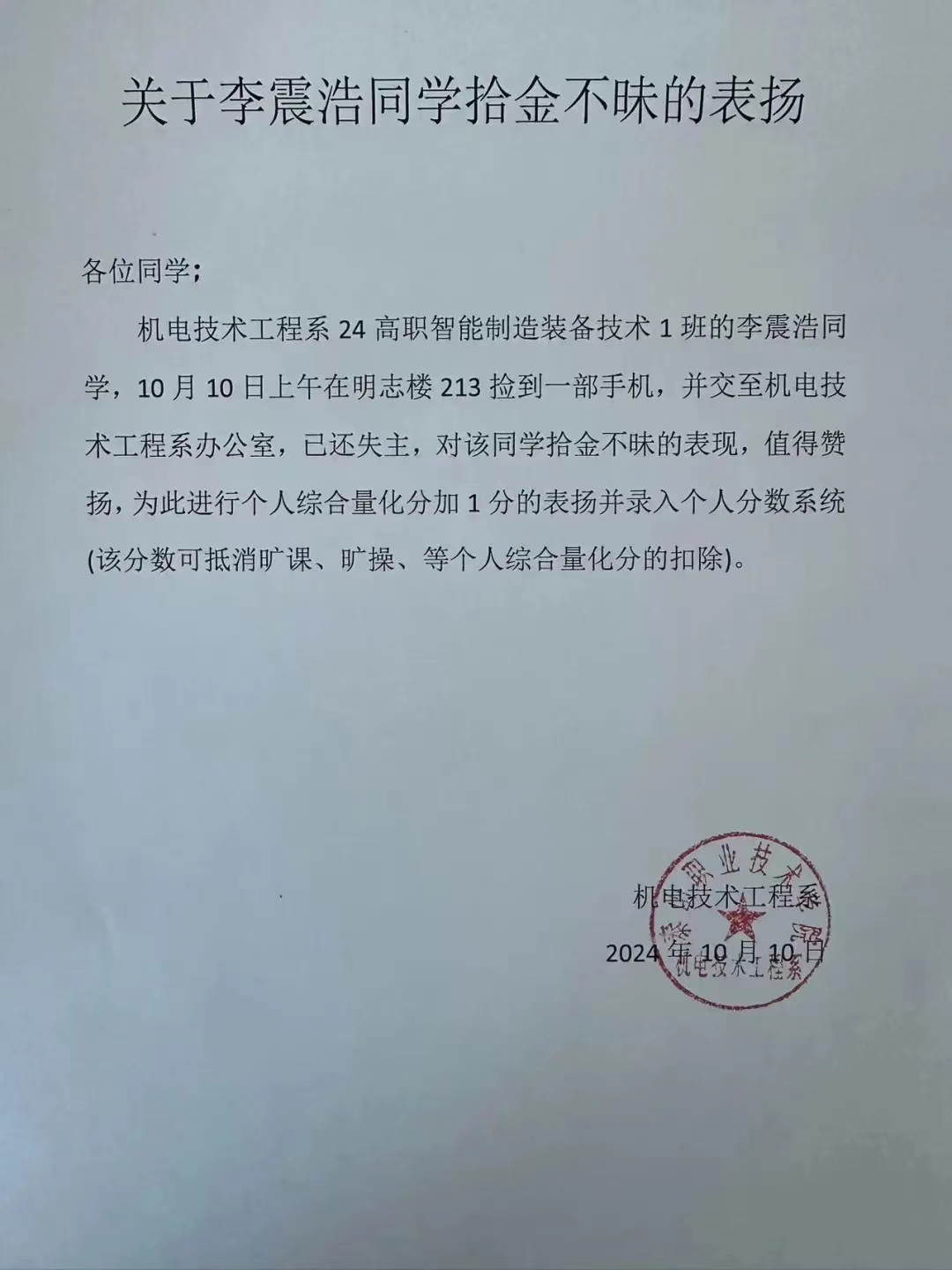为了表达对机电技术工程系2024级高职智能制造装备技术专业的李震浩同学的高度赞扬和衷心感谢,我系十分激动的写下这封表扬信。